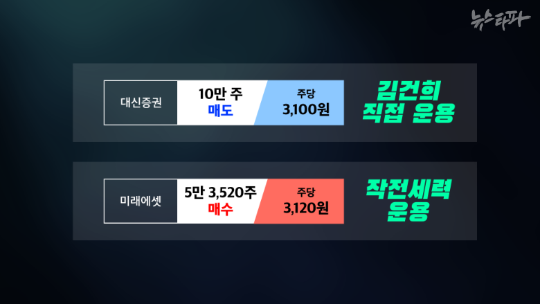 통정매매라는 점 외에도 이날 거래의 이상한 점은 또 있다. 이날 대신증권 계좌에서 10만 주를 3,100원에 매도한 김건희 여사가 다른 계좌, 즉 미래에셋 계좌에서 똑같은 도이치모터스 주식을 더 비싼 가격, 즉 3,120원에 5만 3,520주 사들인 것이다. 3억여 원 어치를 팔아놓고 같은 날 다시 더 비싼 값에 1억 6천여만 원어치를 사들인 셈인데, 이렇게 서로 상반된 거래를 하게된 것은 김건희 여사가 직접 운용한 대신증권 계좌와 달리 미래에셋 계좌는 2차 작전 세력이 운용한 계좌이기 때문이다.