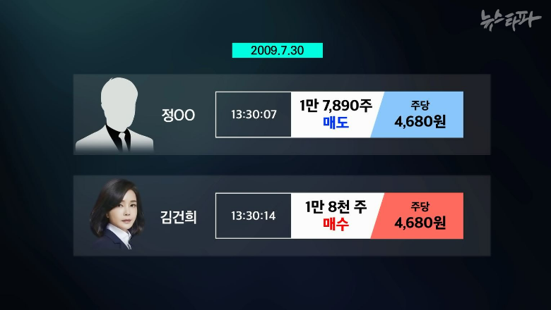 이날 오후 1시 30분 7초, 엿새 전에도 매도 주문을 냈던 권오수 전 회장의 지인 정 모 씨가 도이치모터스 주식 17,890주를 주당 4,680원에 매도하는 주문을 냈다. 7초 뒤 김건희 여사가 도이치모터스 주식 18,000주를 동일한 가격으로 매수했다.