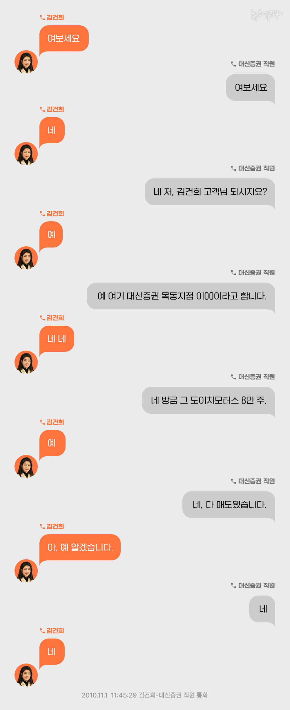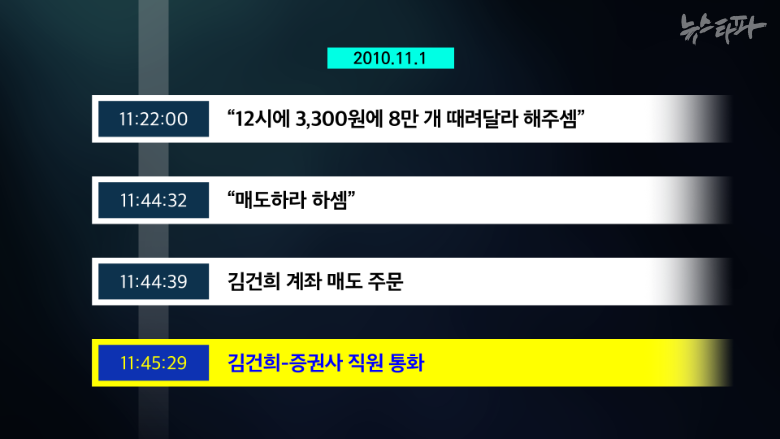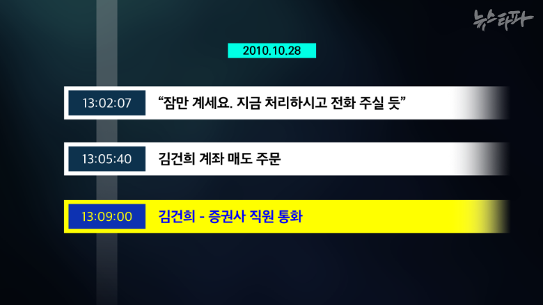 정리하면, 1시 2분에 작전 세력끼리 문자 메시지가 오갔고, 3분 40초 뒤인 오후 1시 5분 9초에 김건희 여사의 계좌에서 매도 주문이 나왔다. 그리고 다시 3분 20초 뒤인 1시 9분 정각, 대신증권 직원이 김건희 여사에게 전화를 걸었다.