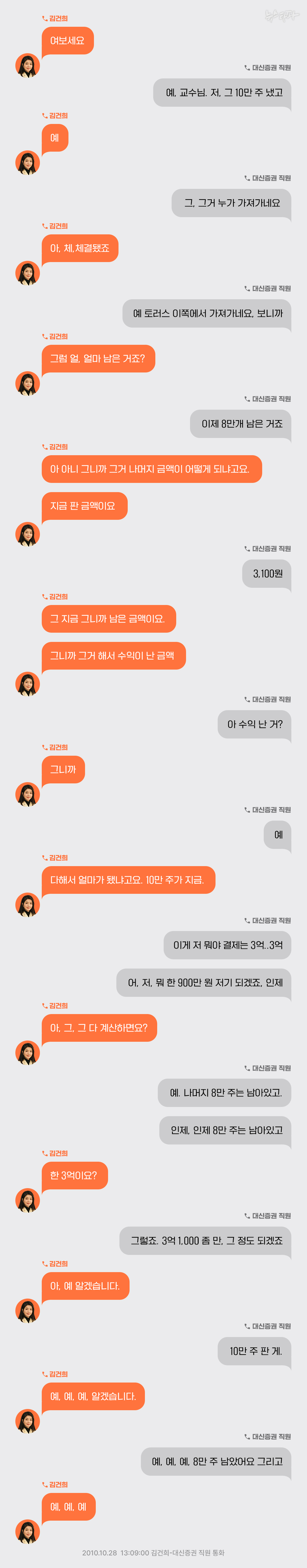 민OO이 2010년 10월 28일 13시 2분 7초 경에 피고인 김OO에게 “잠만 계세요. 지금 처리하시고 전화주실 듯”이라는 문자 메시지를 보내고 약 3분 뒤인 13시 5분 40초부터 해당 계좌 (김건희 대신증권 계좌)에서 주당 3,100원에 100,000주 매도 주문이 제출되어 매매가 체결된다.도이치모터스 주가조작 사건 1심 판결문 66쪽