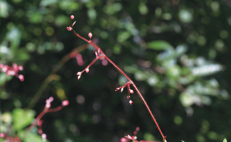 산지의 나무그늘에서 1m 정도 곧게 혹은 약간 비스듬히 자라며 많은 가지가 갈라지며 윗부분은 꽃줄기와 함께 적색 샘털이 밀생한다. 잎은 어긋나기이며 크고 끝은 피침형이고 밑분은 심장저이며 길이 3~13cm, 너비 1~7cm로서 양쪽 기부의 열편이 뾰쪽하고 밖으로 튀어나오며 뒷면 맥 위에 짧고 가시 같은 털이 있다.