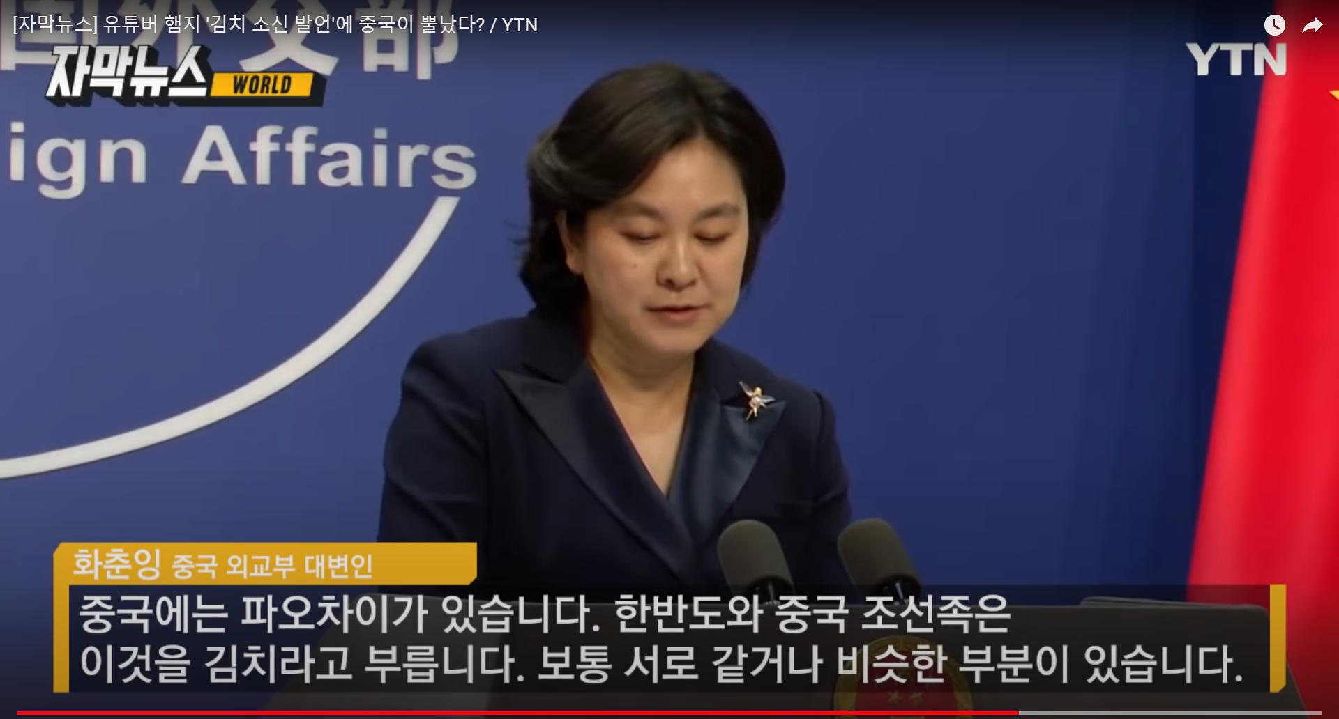 [화춘잉 / 중국 외교부 대변인: 중국에는 파오차이가 있습니다. 한반도와 중국 조선족은 이것을 김치라고 부릅니다. 보통 서로 같거나 비슷한 부분이 있습니다.]