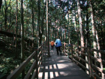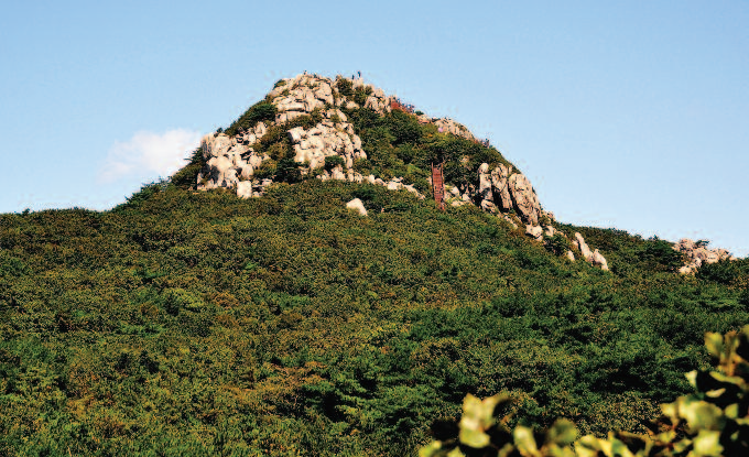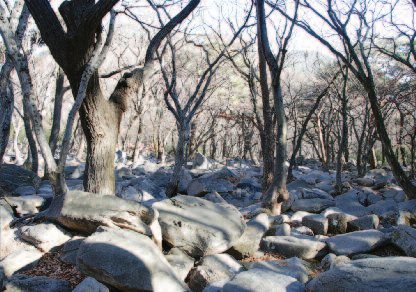 오랜 세월을 거치면서 삭마(削磨)작용을 거듭하여 곳곳에 기반암이 드러난 침봉이 마치 성채(城砦)처럼 우뚝 서있다.