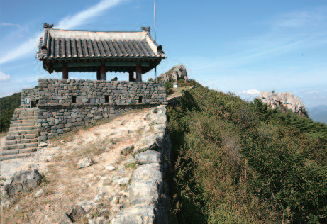 해발550m의암벽단애위에 절묘하게얹혀있듯이서 있는 제3망루는 북문까지 3km이고 동문은 1km의 거리이다.