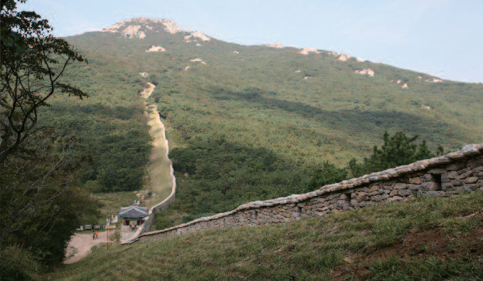 성 밖에서 성을 따라 오르다 뒤돌아보면 고당봉까지 이어진 성과 그 가운데 우뚝 선 북문과의 조화가 아름답다. 첫 봉우리에 올라 건너편에 보 이는 조금 높은 봉우리가 원효봉(元曉峰)이다.