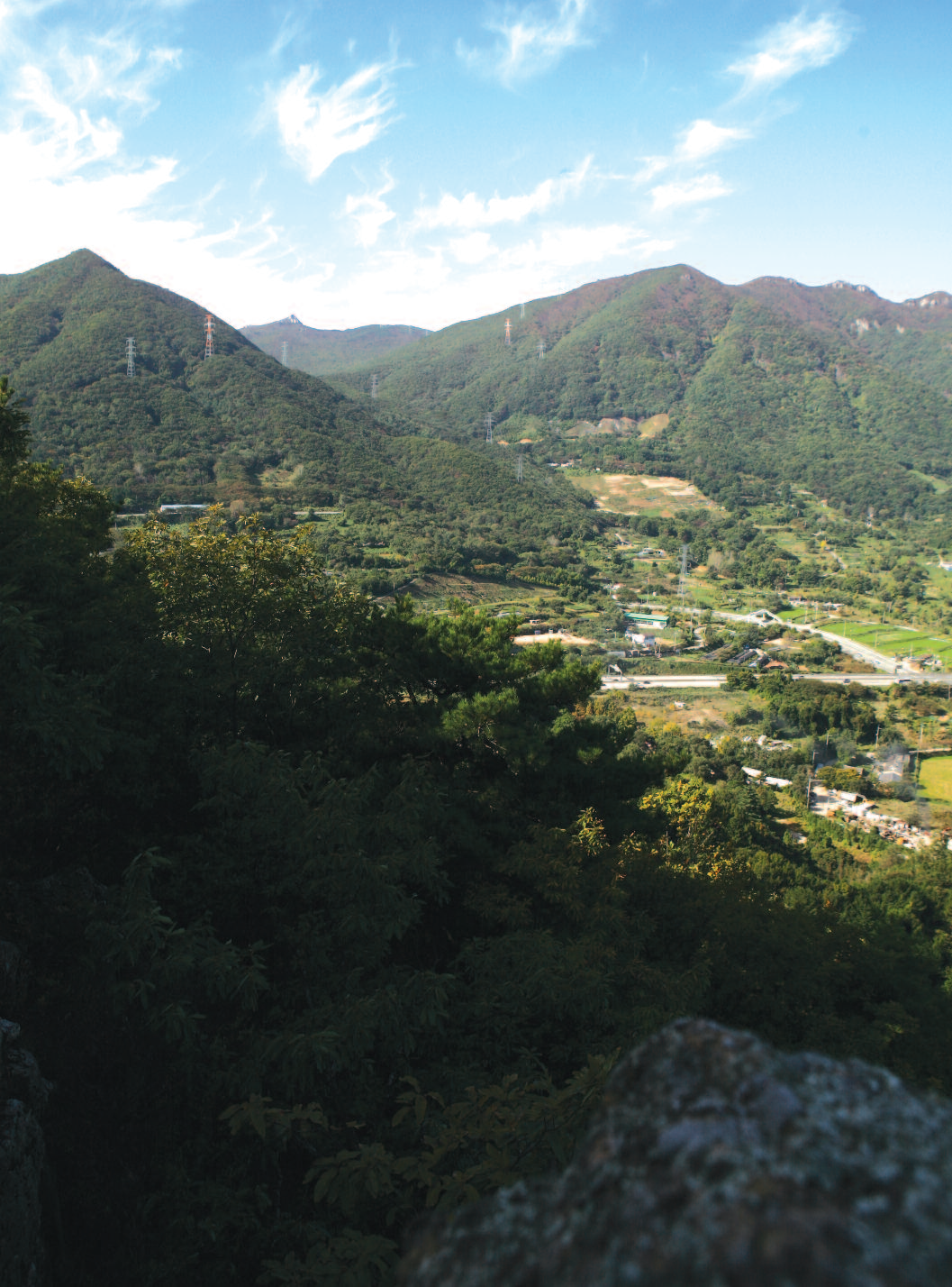리본이 가리키는 대로 부산·양산 경계를 따르다가 대밭을 돌아나가면 벚나무 가로수의 시멘트포장도로가 뻗어 있다. 왼쪽으로 방향을 바꾸면 도로변에‘자두농장’간판과‘개인사업장이오니 출입을 금합니다’는 낙동정맥의 한 구간에 끼어 있는 이 코스는 거리가 짧기는 하지만 하루에도 몇 번씩 경사가 심한 봉우리를 오르내리고 바위봉 넘기를 되풀이해야 하는 백두대간 이나 그 지맥 산행의 진수를 맛볼 수 있다.